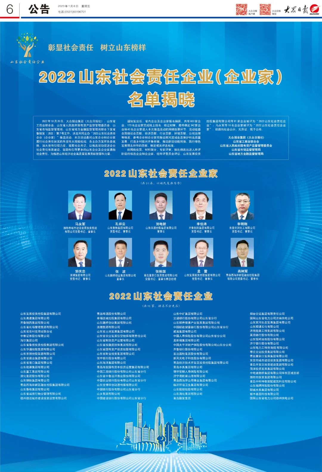 12月29日,“2022山东社会责任企业(企业家)”推选活动终评会举行,经网络投票,初审投票,评审委员会最终评议,青岛董家口发展集团及党委书记 51网站,董事长兼总经理张栋国同志从342家企业和43名企业家名单中脱颖而出,分别荣获“2022山东社会责任企业”和“2022山东社会责任企业家”称号, 。